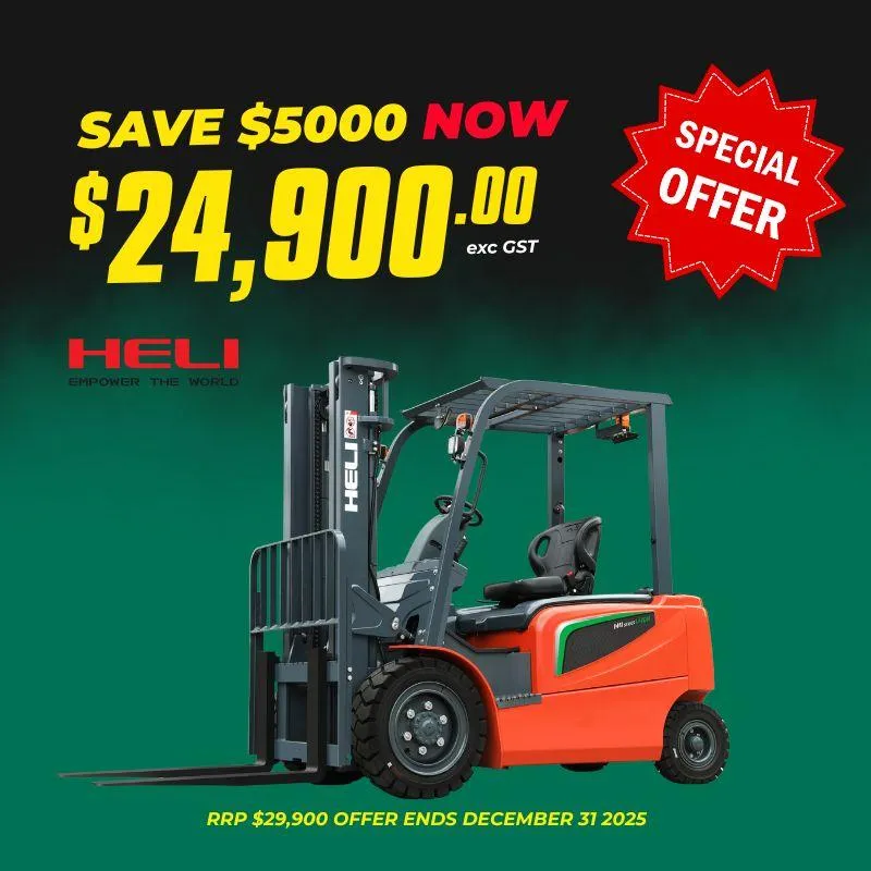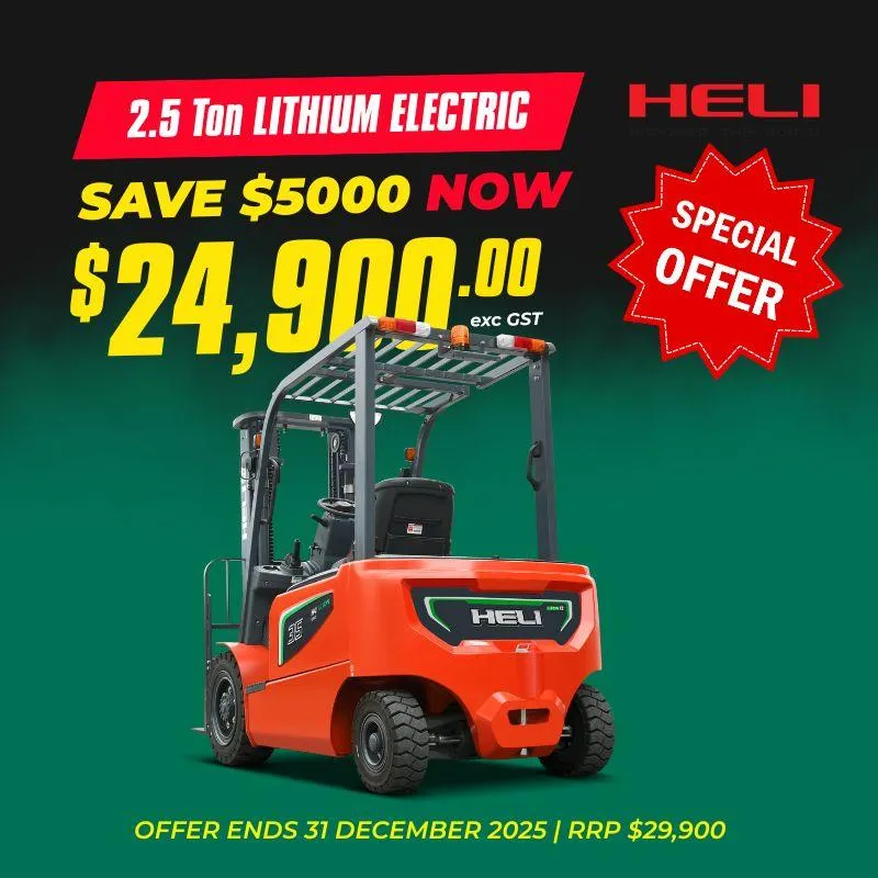 Enter the HELI H4 Premium Electric 2.5 Ton forklift, our lithium beast swapping leaky lead-acids and fossil fuels for sealed, spill-proof power. To launch our Henderson branch, snag a straight-up $5K factory discount. This offer wont last long!